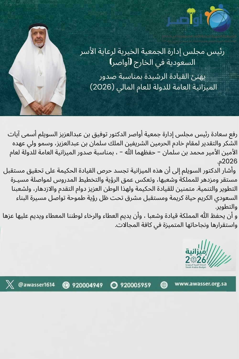 رئيس مجلس إدارة الجمعية الخيرية لرعاية الأسر السعودية في الخارج (أواصر) يهنئ القيادة الرشيدة بمناسبة صدور الميزانية العامة للدولة للعام المالي 2026م